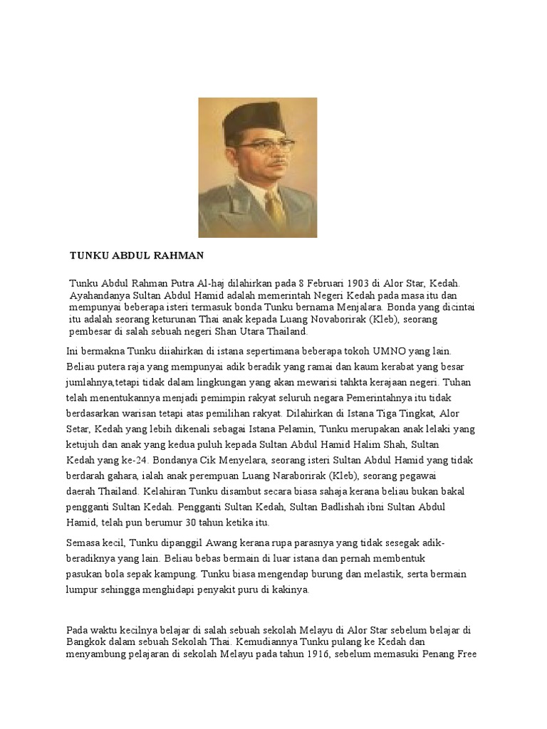 Kewibawaan tunku yang berjaya menyatukan penduduk negara ini telah menyakinkan penjajah british untuk memberi kemerdekaan kepada persekutuan tanah melayu peranan tunku abdul rahman putra dalam usaha mencapai. Dewan bahasa dan pustaka, kuala lumpur. Tunku abdul rahman mendapat pendidikan awal di sekolah debsurin, bangkok, thailand dan penang free school. First prime minister of malaysia. توانكو عبدالرحمن ابن المرحوم توانكو محمد;